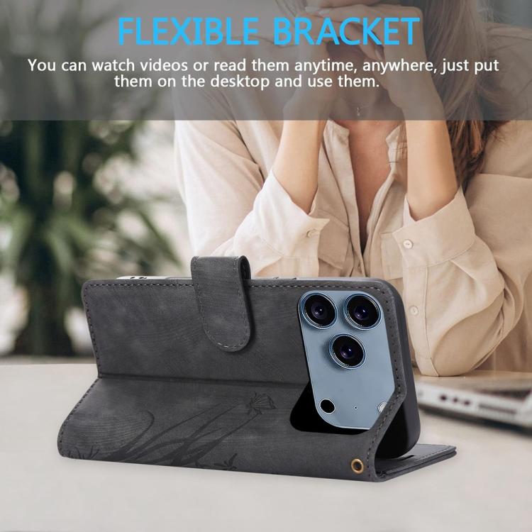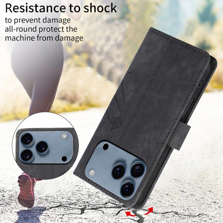 Funda de piel con relieve de mariposa y orquídea para iPhone 17 Pro (negra)