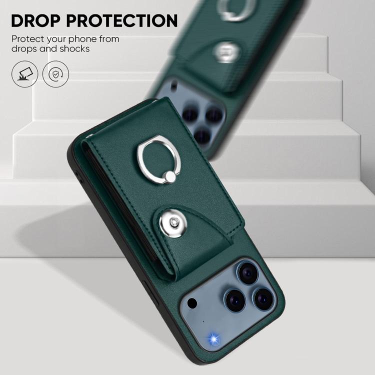 Funda de PU con cordón para iPhone 17 Pro, con tarjetero, anillo y soporte (verde)