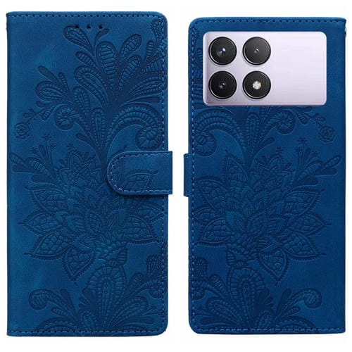 Funda de Teléfono con Hebilla Magnética de Pu con Encaje Floral En Relieve para Redmi K70E/Poco X6 Pro y Correa para la Muñeca (Azul)