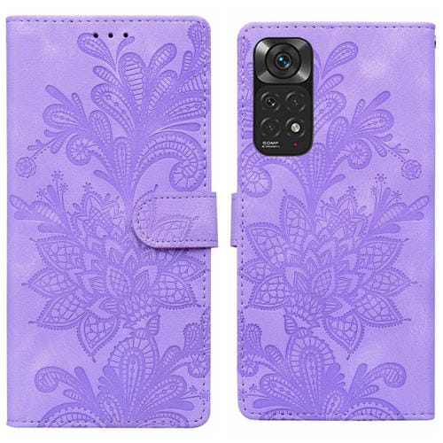 Funda de Teléfono con Hebilla Magnética de Pu con Encaje Floral En Relieve para Redmi Note 11 Global con Correa para la Muñeca (Morado)