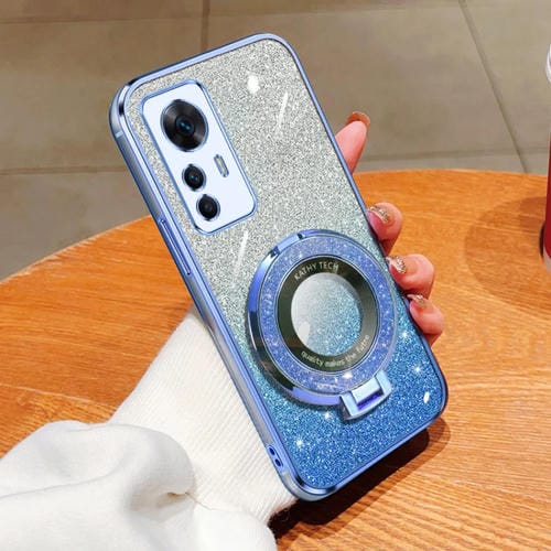 Funda de Teléfono de TPU con Soporte Redondo y Purpurina Degradada Plateada para Xiaomi 12T Pro (Azul Sierra)