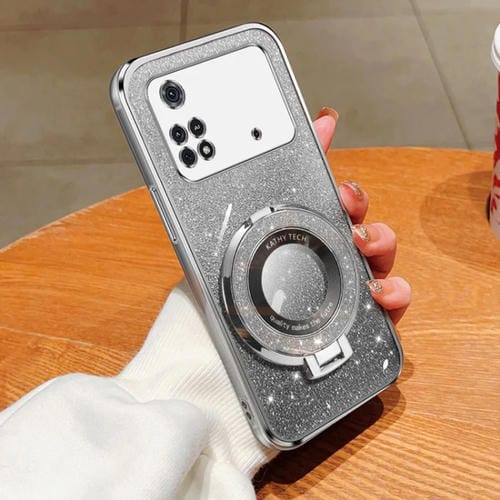 Funda de Teléfono de TPU con Soporte Redondo y Purpurina Degradada Plateada para Xiaomi Poco M4 Pro (Plateada)