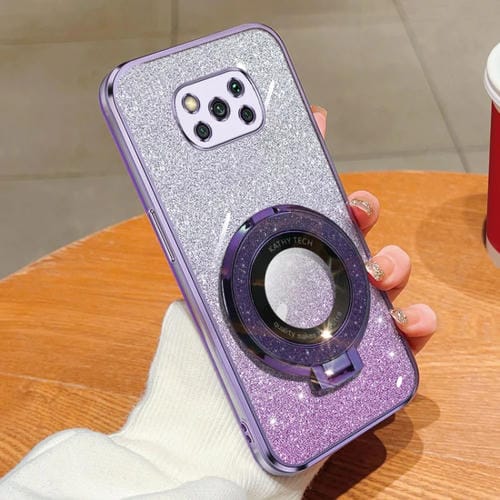 Funda de Teléfono de TPU con Soporte Redondo y Purpurina Degradada Plateada para Xiaomi Poco X3/X3 Pro (Morado)