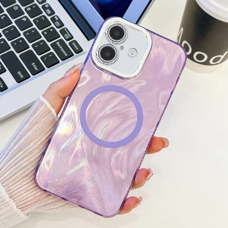 Funda de Teléfono TPU Magsafe iPhone 16 Textura Enchapada Película Lente Brillo (Hilo de Plumas Morado)