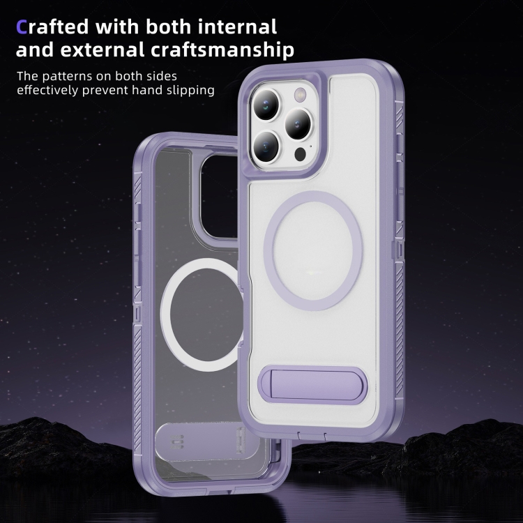 Funda híbrida TPU y PC con soporte Magsafe para iPhone 16 Pro Max (Transparente y Morada)