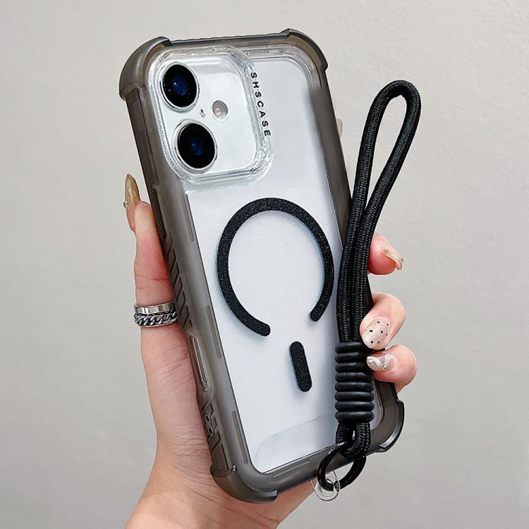Funda híbrida de TPU y PC transparente mate 3 en 1 MagSafe para iPhone 17 con correa de muñeca (negra)