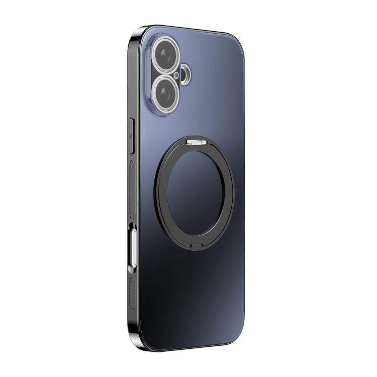 Funda MagSafe electrochapada para iPhone 17 con soporte giratorio de 360 grados y cubierta para lente (negra).