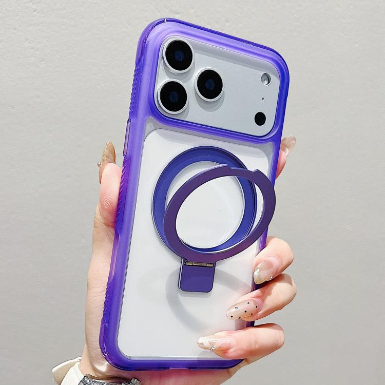 Funda MagSafe para iPhone 17 Pro con borde translúcido y soporte metálico (morado)