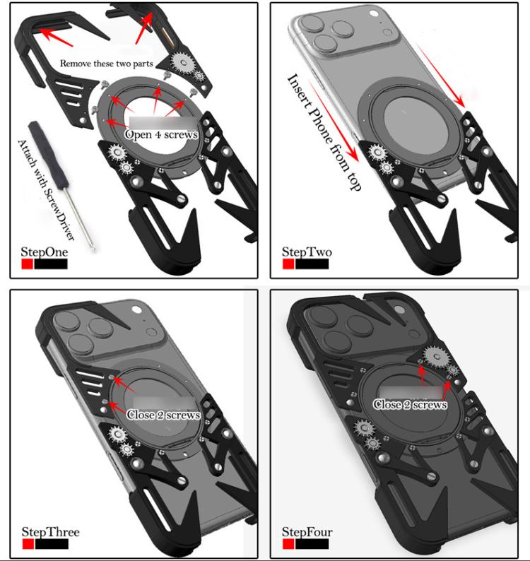 1. Material metálico, mecanizado de precisión, ensamblado con tornillos y desmontable.