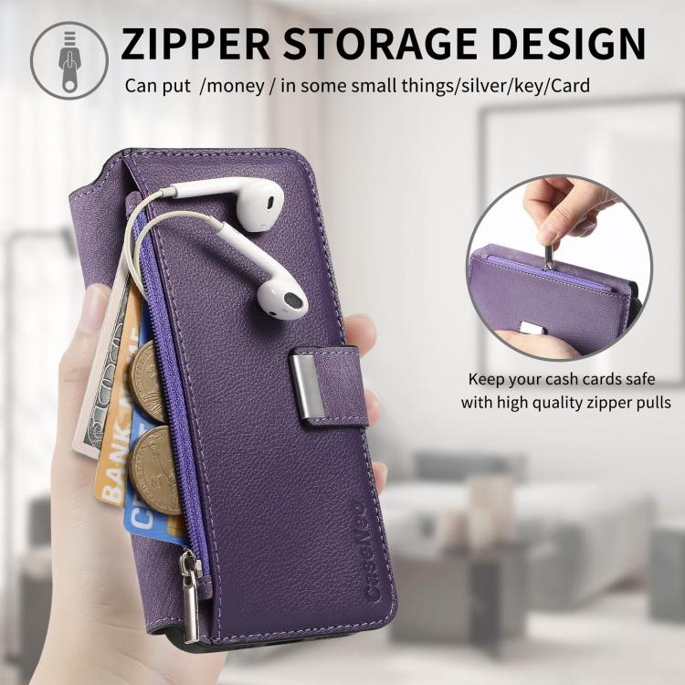 2. Función de billetera con cremallera: La funda de cuero está equipada con una billetera con cremallera y ranuras para tarjetas y dinero en efectivo.