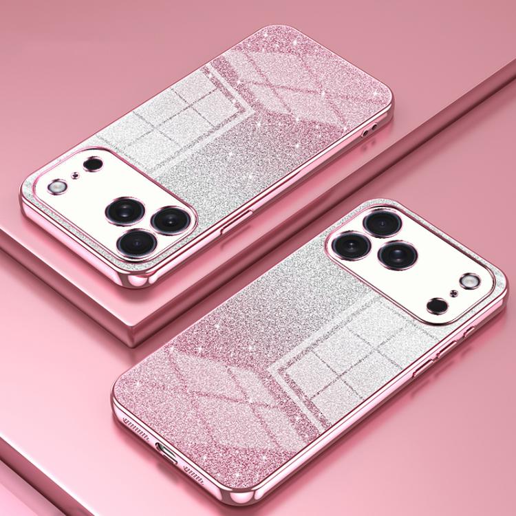 Funda para iPhone 17 Pro con purpurina en polvo degradado y galvanizada (rosa)