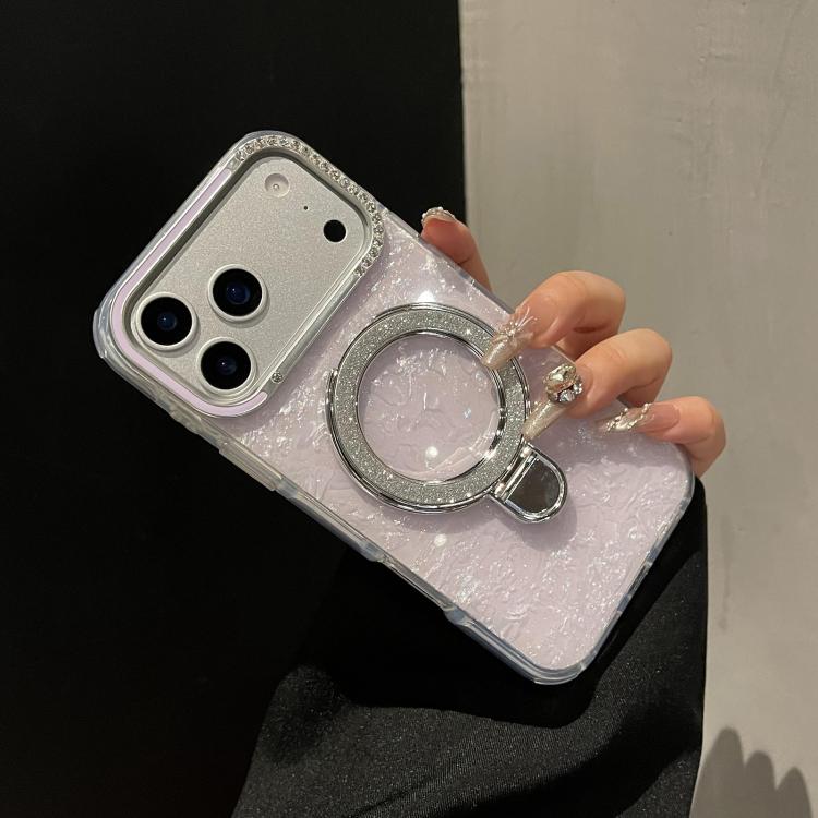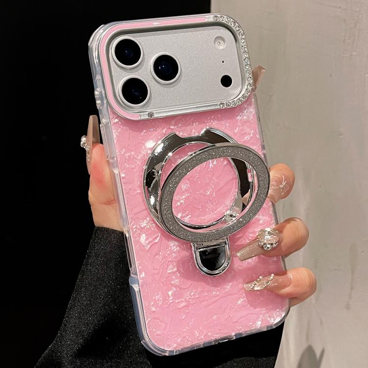 Funda para iPhone 17 Pro Max con carcasa dorada y colorida, diseño estampado en TPU+IMD, con soporte magnético brillante (rosa).