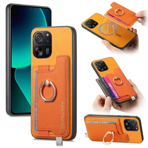 Funda para Teléfono con Anillo de Cuero con Soporte para Tarjetas y Magsafe Cross para Xiaomi 13T/13T Pro Retro (Amarillo)