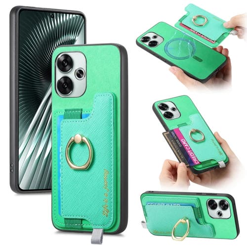 Funda para Teléfono con TaRJetero y Anillo de Cuero con Diseño Retro Magsafe Cross para Redmi Turbo 3 5G (Verde)