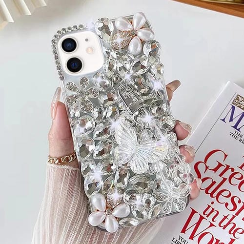 Funda para Teléfono PC con Diamantes y Mariposas para iPhone 12 Mini (Blanca)
