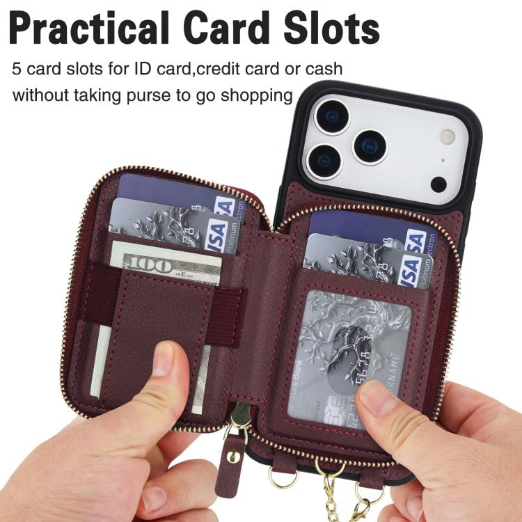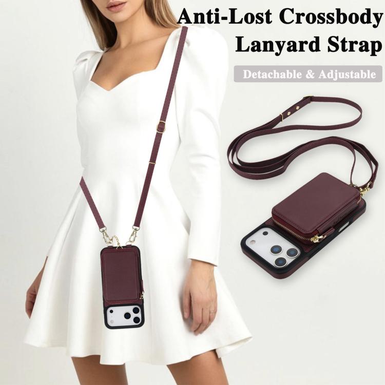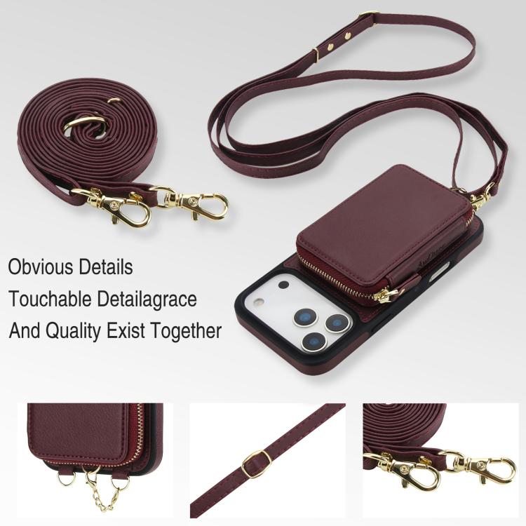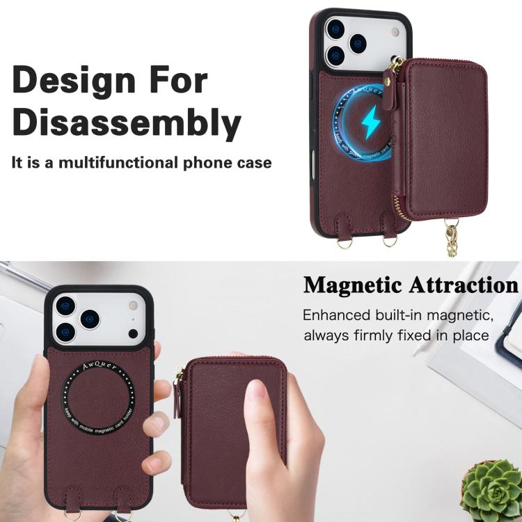 Funda tipo cartera bandolera con cremallera AwQuer 2 en 1 para iPhone 17 Pro, con parte trasera de cuero (rojo vino).