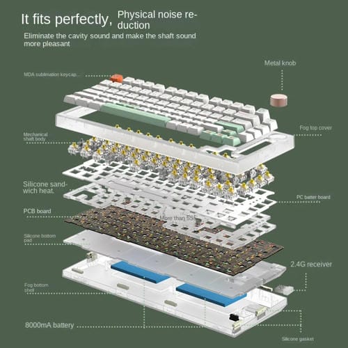 El Kit de Teclado Mecánico Personalizado de Conexión en Caliente RGB Inalámbrico (Blanco) es un Conjunto avanzado diseñado para usuarios que requieren un Teclado mecánico versátil y personalizable. Compatible con ejes de 3 y 5 pines, este kit permite la instalación y cambio de teclas en caliente, facilitando la personalización sin necesidad de herramientas Adicionales. Soporta múltiples modos de Conexión Inalámbrica, incluyendo Bluetooth en tres modos y Conexión por Cable USB, adaptándose a diferentes dispositivos y entornos de uso. Su función principal es ofrecer una experiencia de tecleo ergonómica y silenciosa, gracias a su estructura con almohadillas de silicona y Placa de posicionamiento de PC, además de una iluminación RGB ajustable con 16,8 millones de colores y efectos programables para optimizar la visibilidad y estética del Teclado.