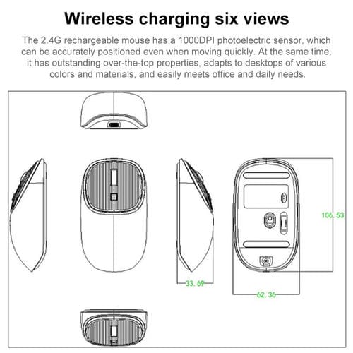 - Resolución ajustable: 1000-1200-1600 DPI; Tamaño: 106,5x62,5x33,5 mm; Batería reCargable de 500mA con Carga Type-C (5V, 1A); Interruptor silencioso Huanyu con vida útil de 5 millones de clics
