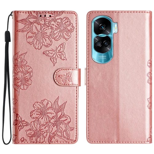 Funda para Honor 90 Lite 5G Cherry Blossom Butterfly Skin Feel de PU en Relieve (Oro Rosa)
