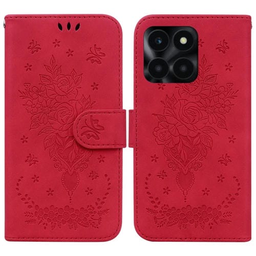 Funda para Honor X6A de Cuero con Relieve Mariposa y Rosa (Rojo)