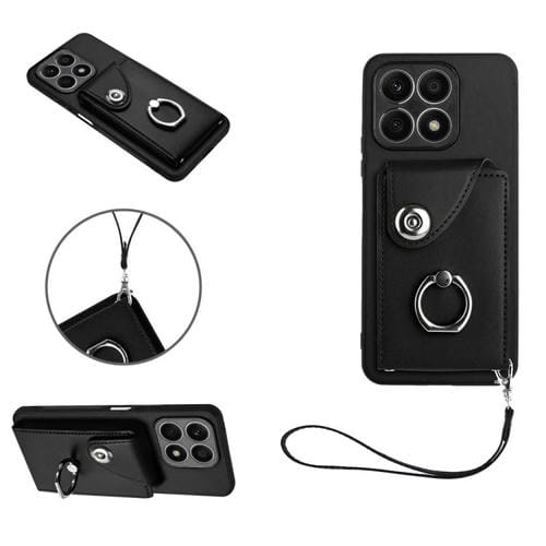 Funda para Honor X8A de PU con Soporte para Anillo, Bolsa para Tarjeta y Cordón (Negro)