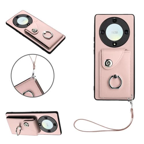 Funda para Honor X9A y Magic5 Lite de PU con Soporte para Anillo y Bolsa para Tarjeta con Cordón (Rosa)