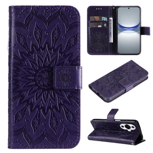 - 1x Funda de Cuero para Huawei Nova 12S con Tapa y Patrón de Girasol en Relieve (Púrpura)