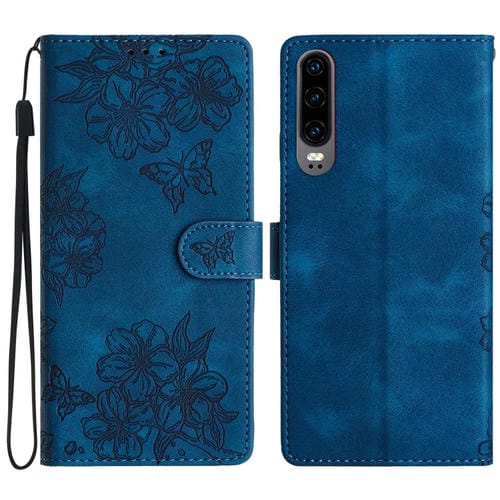 - 1x Funda para Huawei P30 Cherry Blossom Butterfly Skin Feel de PU en relieve (Azul)