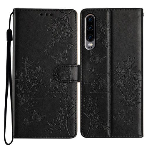 Funda de Cuero para Huawei P30 con Relieve de Flor y Mariposa (Negro)