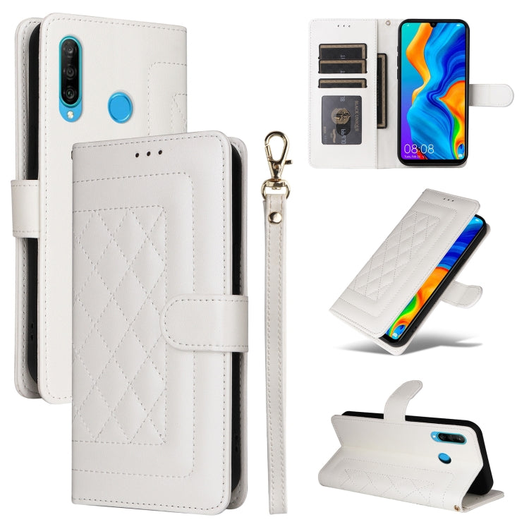 Funda de Teléfono Huawei P30 Lite con Tapa de Cuero Diamond Lattice (Blanco)