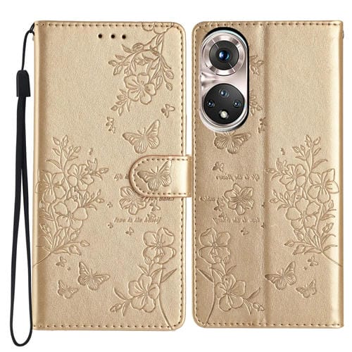 Funda de Cuero para Huawei P50 Pro Butterfly Love Flower con Relieve (Oro)