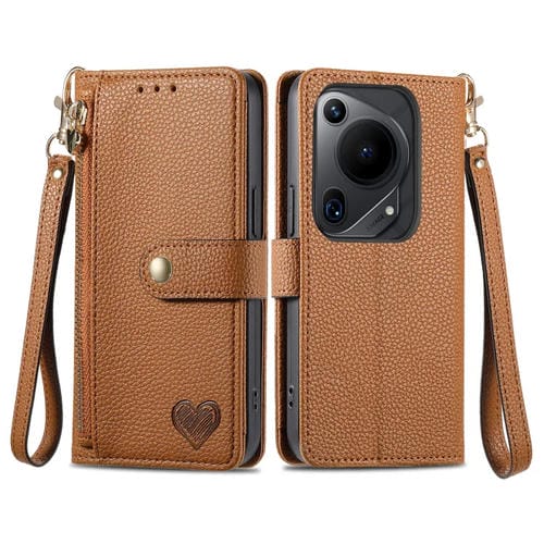 Funda de Cuero Huawei Pura 70 Ultra Love con Zipper y Lanyard para Teléfono (Marrón)