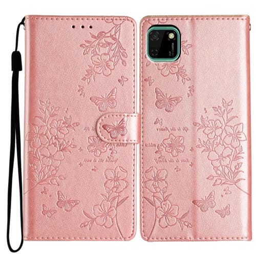 Funda de Cuero Huawei Y5P Butterfly Love Flower con Relieve para Teléfono (Oro Rosa)