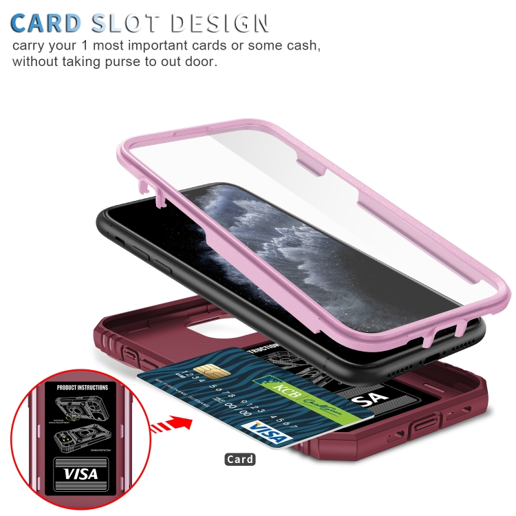 Funda Protectora para iPhone 11 Pro TPU + PC con Cubierta de Cámara Deslizante Soporte Giratorio 360 Ranura para Tarjeta (Rosa + Rojo Oscuro)