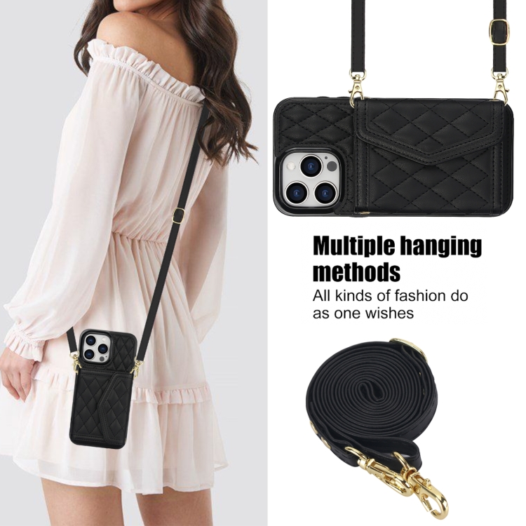 Estuche para teléfono iPhone 11 Pro con bolsa para tarjetas textura rómbica y empalme con cordón largo (Negro)