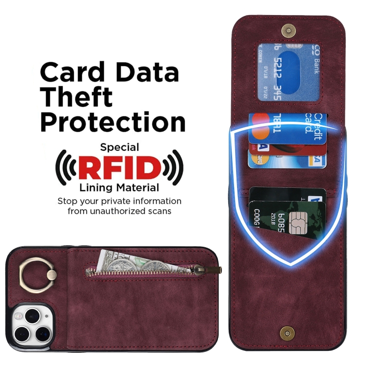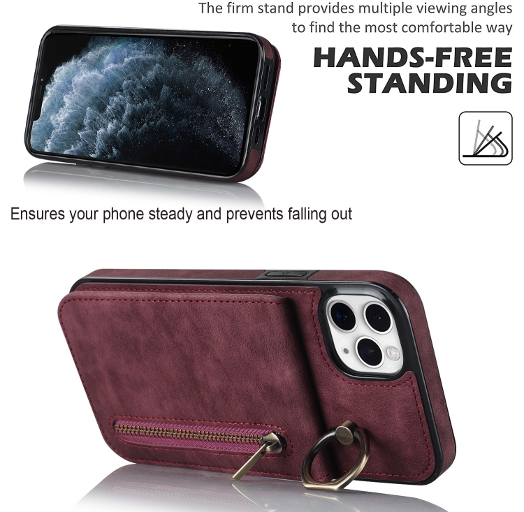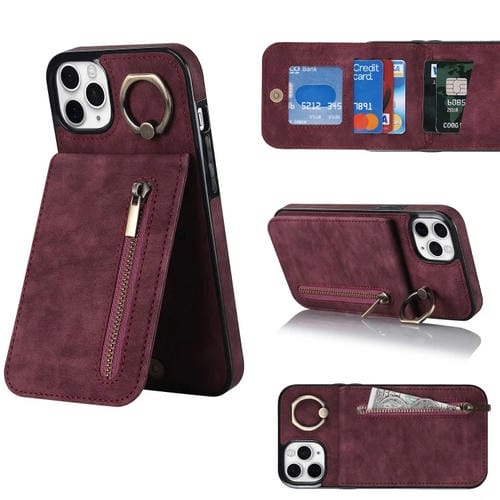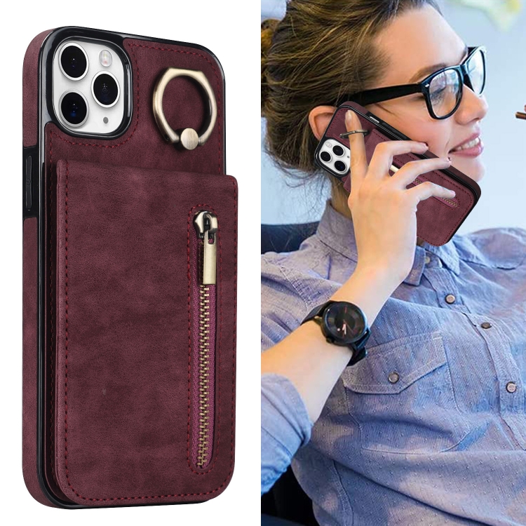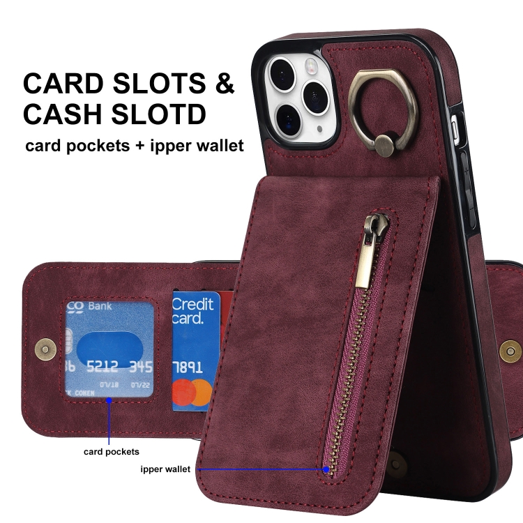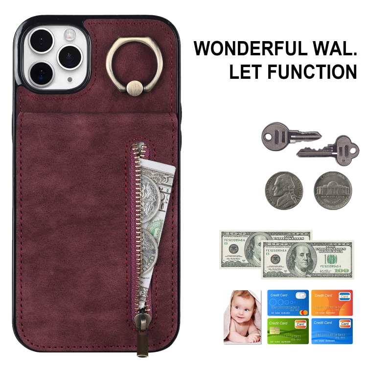 Estuche para Teléfono iPhone 11 Pro Max Anillo Retro Cremallera Ranura para Tarjeta Rfid (Rojo Vino)