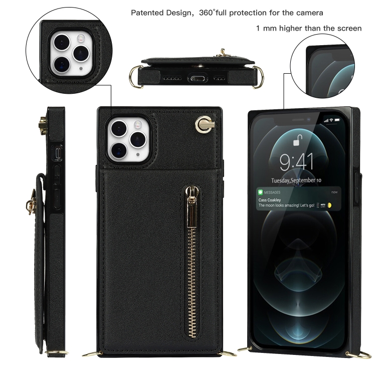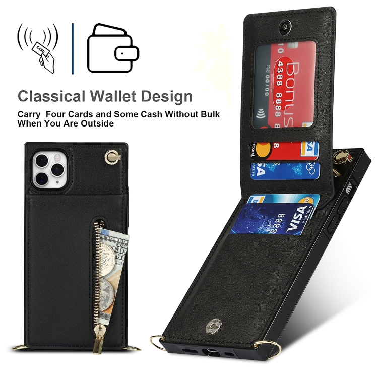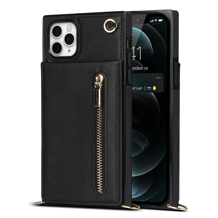 Funda Trasera para iPhone 11 Pro Max Cross-Body Zipper Square TPU + PU con soporte, ranuras para tarjetas, billetera y correa (Negro)