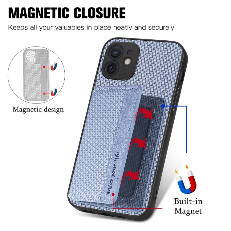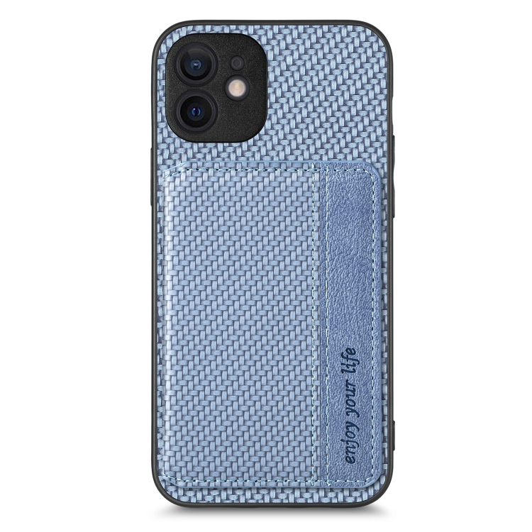 Funda de teléfono para iPhone 11 Pro Max con bolsa de tarjeta magnética de fibra de carbono (Azul)