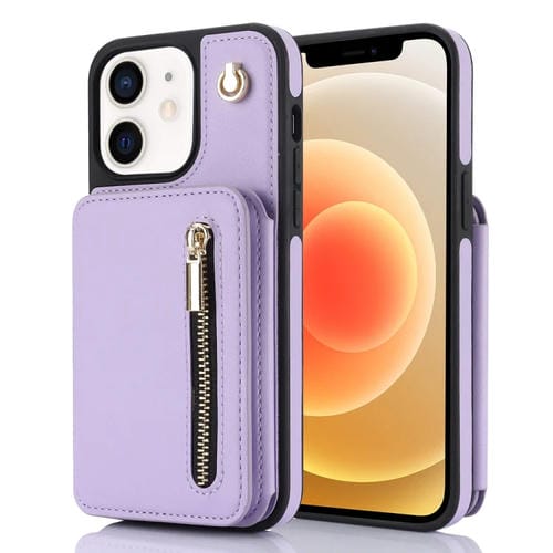 Estuche para teléfono Ym006 iPhone 12/12 Pro con bolsa para tarjetas cremallera y cordón doble (Púrpura Claro)