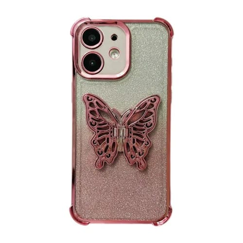 Estuche para teléfono TPU iPhone 12 a prueba de golpes con cuatro esquinas y mariposa 3D con brillo galvanizado (Rosa Degradado)