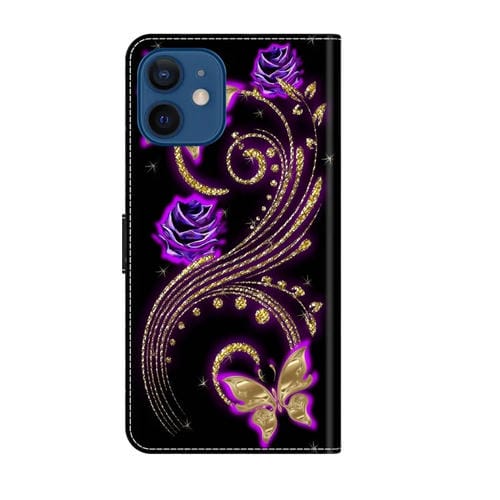 Funda Protectora de Cuero iPhone 12 Mini 13 Mini Crystal 3D a Prueba de Golpes (Mariposa de Flor Púrpura)