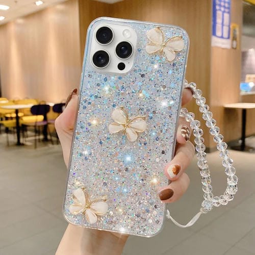Funda para Teléfono TPU Epoxi iPhone 12 Pro Mariposa de Jade Lentejuelas Estrelladas con Correa (Plateada)