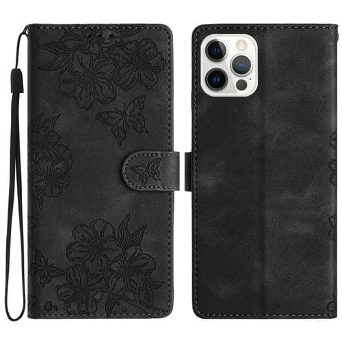 Funda para teléfono iPhone 12 Pro Max Cherry Blossom Butterfly Skin Feel de PU en relieve (Negro)
