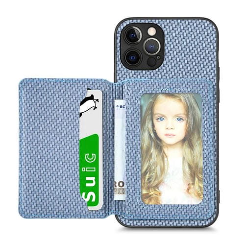 Funda de teléfono para iPhone 12 Pro Max con bolsa de tarjeta magnética de fibra de carbono (Azul)