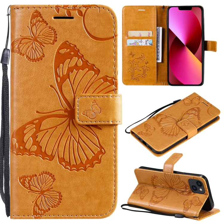 Estuche de Cuero iPhone 13 con Tapa Horizontal, Patrón Mariposa 3D, Soporte, Ranura Tarjeta, Billetera y Cordón (Amarillo)