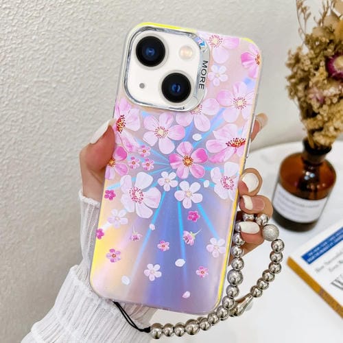 Funda para Teléfono iPhone 13 Flor Láser Galvanizada con Correa para Muñeca (Flor Rosa)
