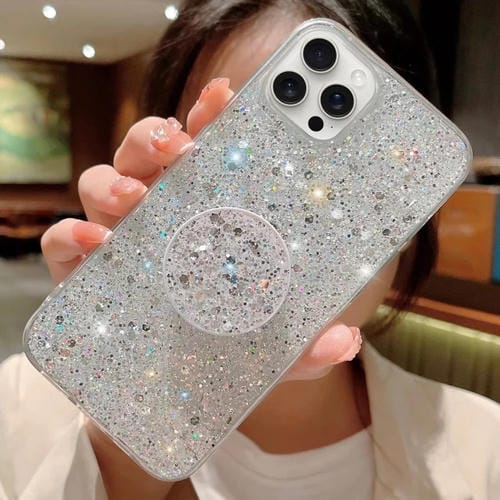 Estuche para Teléfono TPU Epoxi iPhone 13 Pro Max Soporte Redondo Lentejuelas Estrelladas (Plateado)