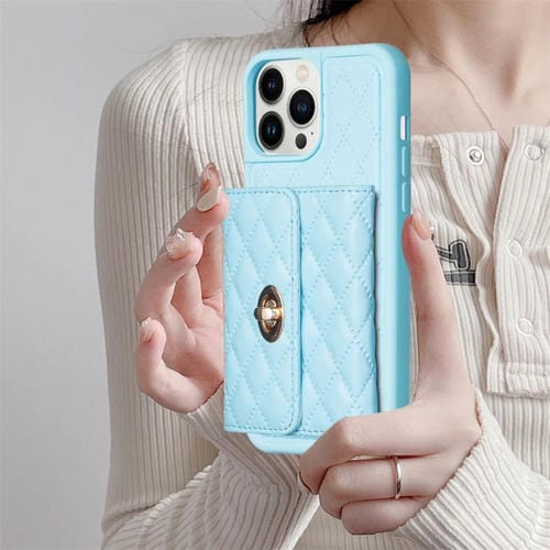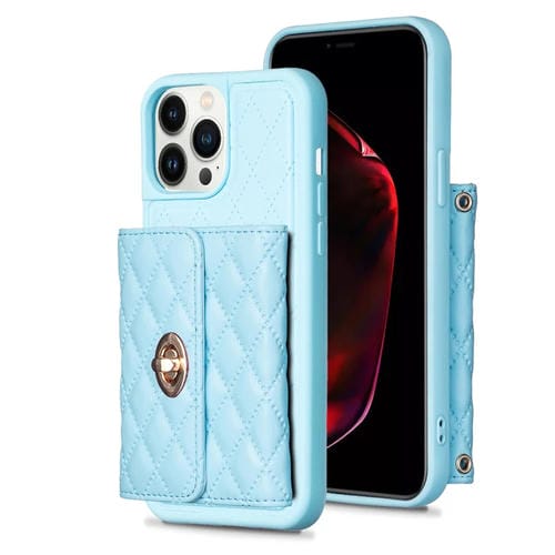 Funda para iPhone 13 Pro Max Horizontal Metal Hebilla Monedero Rombico Cuero (Azul)