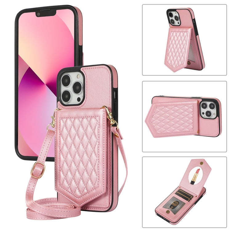 Funda para iPhone 13 Pro Rhombic Texture Rfid con Cordón y Espejo (Oro Rosa)