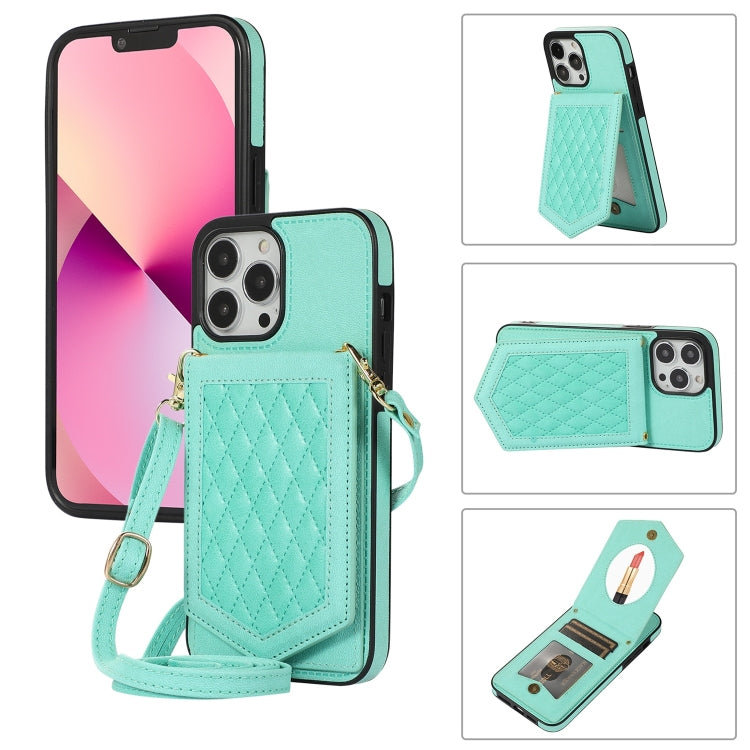 Funda para iPhone 13 Pro Rhombic Texture Rfid con Cordón y Espejo (Verde Menta)